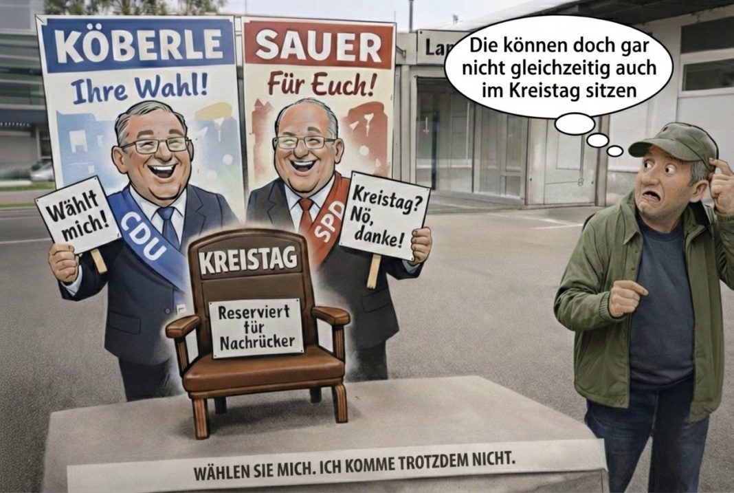 Nur mit dem kleinen Haken, dass beide gar nicht vorangehen können. Denn wer Landrat ist, kann nicht gleichzeitig Kreistagsabgeordneter sein, ohne sein Amt aufzugeben. Und niemand erwartet ernsthaft, dass im Landratsbüro plötzlich das Licht ausgeht, nur weil ein Stuhl im Kreistag frei wird.