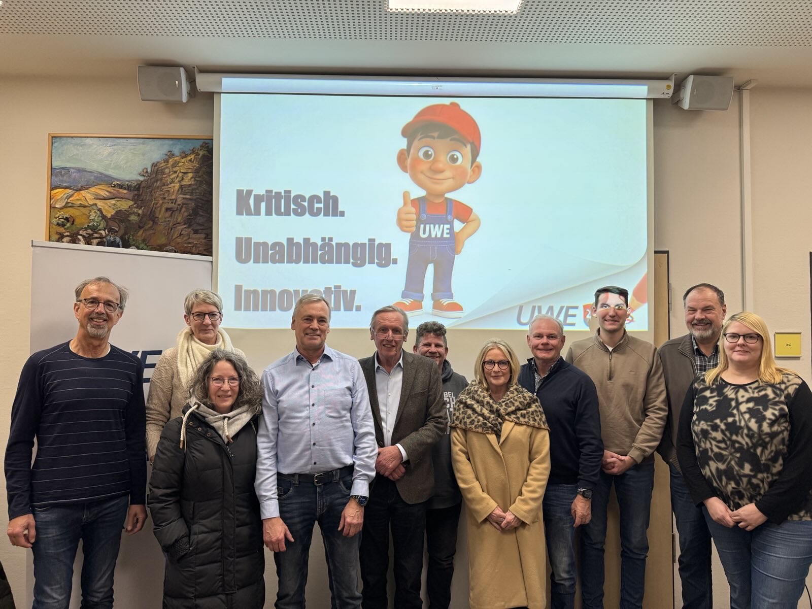 Der Sitzungssaal des ehemaligen Rathauses war gut gefüllt, als der erste Vorsitzende Jürgen Hundler die anwesenden Mitglieder der Unabhängigen Wähler Eisenbach (UWE) zur Jahreshauptversammlung am Abend des 01. Dezember begrüßte. Ein strammes Programm erwartete die über 30 Teilnehmenden, denn es standen Neuwahlen des Vorstandes sowie die Vorstellung der Kandidatinnen und Kandidaten für die Kommunalwahl im März des kommenden Jahres an. Zu Beginn erläuterte Hundler die Schwerpunkte der aktuellen politischen Themen in Selters: Die Konzepte zur Wasserversorgung, den Stand bei alternativen Energien, die Diskussionen um das Gewerbegebiet und den Anteil der Gemeinde an der Finanzierung der Kindertagesstätten. Seine Ausführungen zum Haushaltsentwurf waren detailliert und mit vielen Zahlen gespickt. Am Ende der Rede betonte er, dass er immer gerne für UWE und im Gemeindevorstand tätig war, nun aber etwas zurückstecken wolle und ins zweite Glied treten möchte. Uwe Kolb und Lo Siegmund würdigten seine Verdienste für UWE und sein herausragendes Engagement für die Gemeinde und überreichten ein kleines Präsent.